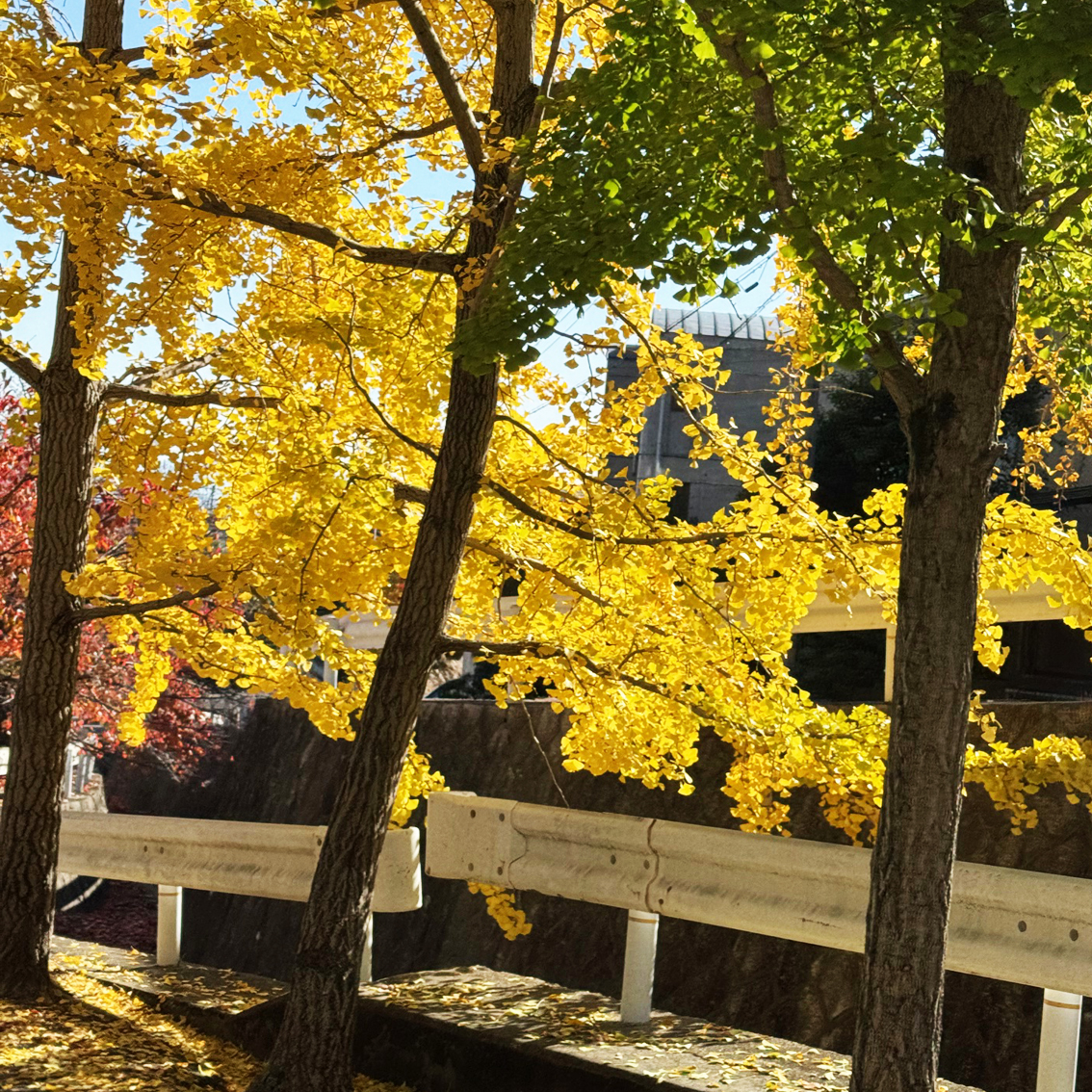 目神山の紅葉は見ごたえたっぷりだが、 実は黄葉(こうよう)も見ごたえがある。 モミジの落葉後、今年も鮮やかなイチョウが辺りをターメリックにしていた。 紅葉と黄葉が合わさり、初めてあの美しい景観が出来ていることに気づく瞬間。